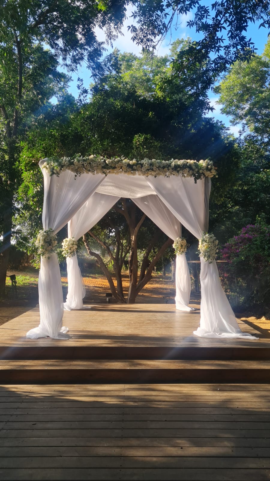 בד מתנפנף, עמודי עץ בהירים, פרחים עדינים ורוח שמוסיפה קסם שלא ניתן לשחזר במקום אחר.